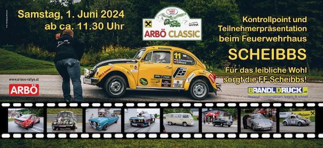 Am Samstag dem 1.Juni 2024 wird die ARBÖ CLASSIC ab ca 11 Uhr 30 Scheibbs passieren. Der Kontrollpunkt befindet sich beim Feuerwehrhaus Scheibbs, für das leibliche Wohl wird die Freiwillige Feuerwehr Scheibbs sorgen.